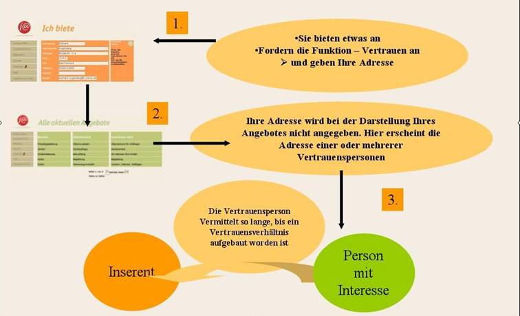 Sollten Sie das Gefühl haben, dass Sie Hilfe am Anfang einer neuen Kooperation benötigen, so können Sie sich über die j@ Börse eine Begleitperson vermitteln lassen. In diesem Fall können Sie den Punkt „Vertrauen“ anklicken. In diesem Fall wird bei der Darstellung Ihres Angebotes nicht Ihr eigener Name angezeigt sondern es werden die Namen von vertrauenswürdigen Personen gezeigt. Diese Personen übernehmen dann die Aufgabe, Sie mit dem Interessenten in Kontakt zu bringen und Sie auch über eine gewisse Zeit zu begleiten.