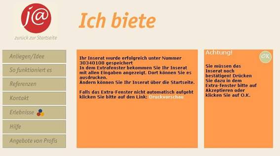 Sie gelangen nach der Druckvorschau zurück zu der Seite für die Auftragsbestätigung und schließen den Vorgang durch Betätigung des „OK – Knopfes“ ab. Es ist geschafft – Ihr Angebot ist aktiv in der j@ Börse angelegt worden.