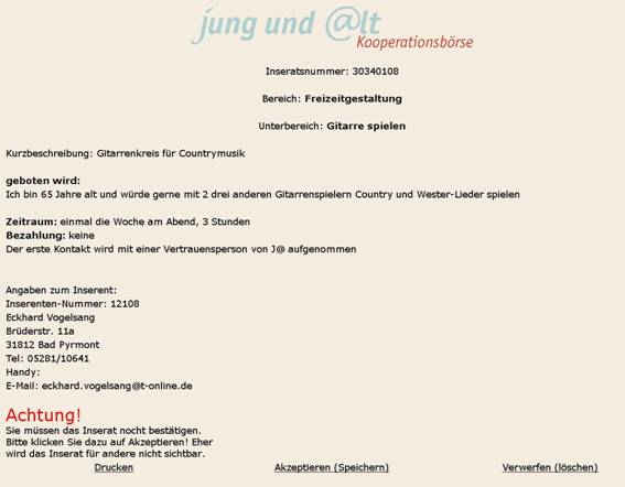 Wenn Ihr Inserat komplett erstellt ist, erhält es eine Nummer, die Inseratsnummer. Im Beispiel 30340108. Mit dieser Nummer können Sie Ihr Inserat jederzeit ändern. Änderungen nehmen Sie vor über den Zweig „Ich biete – meine Unterstützung - Inserat ändern“. Die Nummer wird Ihnen über die Druckvorschau des gesamten Inserates mit angezeigt. Hier können Sie das Inserat dann ausdrucken oder sich die Nummer aufschreiben – wichtig für spätere Änderungen!